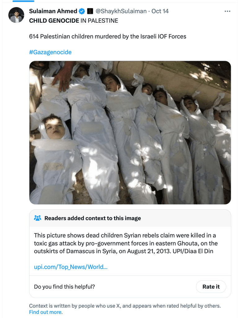 A community note from X stated that the picture was a 2013 sarin gas attack in Ghouta, Syria, and not from the Israel-Hamas war